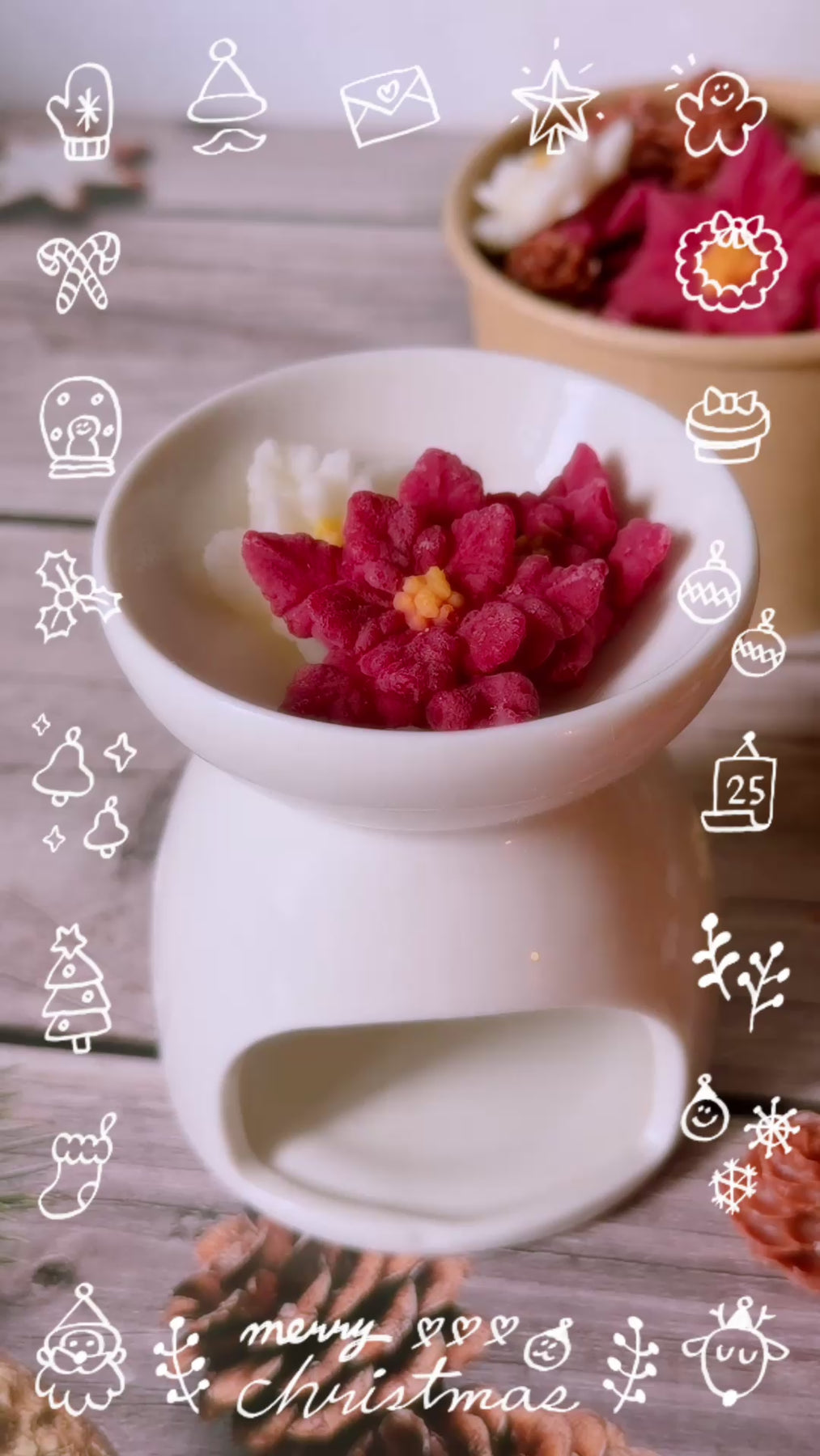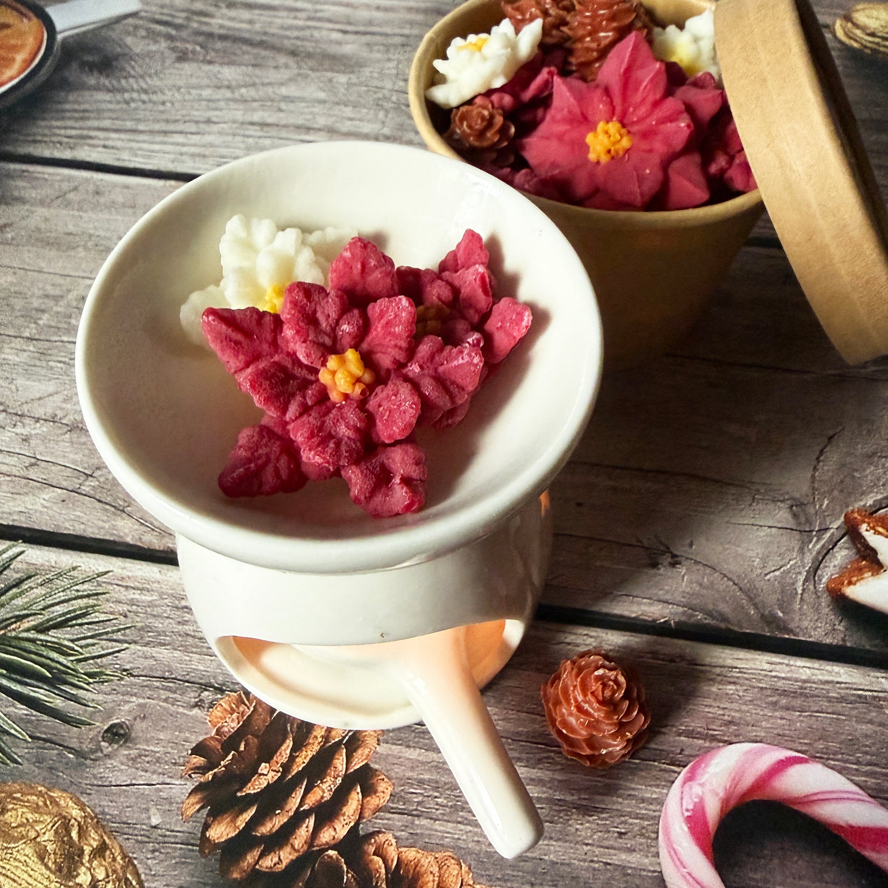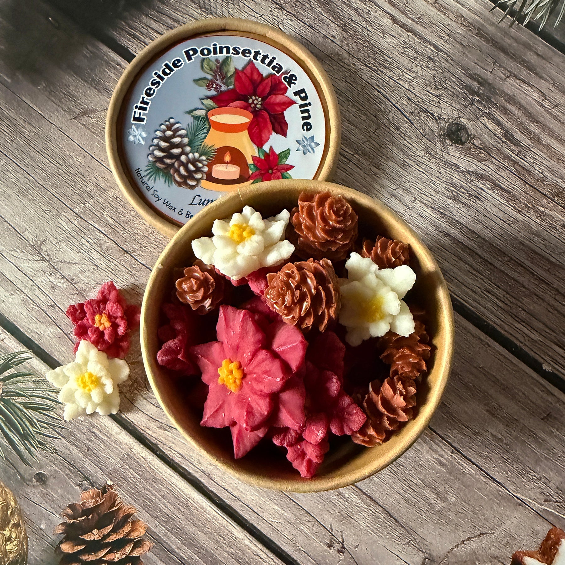 Each melt is shaped into delicate poinsettias and rustic pine cones, creating a charming Christmas gift or winter decoration.